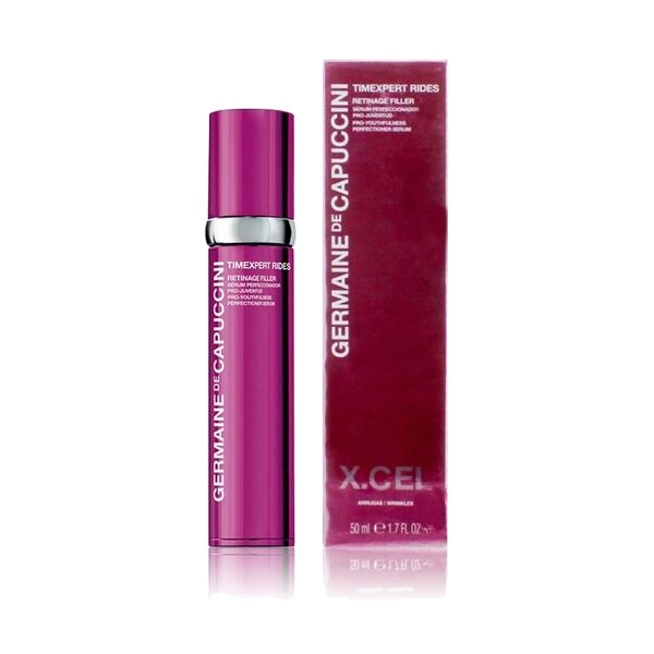 Germaine De Capuccini Timexpert Rides X-Cel Retinage Filler Serum ứng dụng công nghệ làm đầy Pro-Collagestine, thành phần có chứa phức hợp Retinol Bio RDS độc quyền, retinol hyđro hóa, bơ hạt mỡ, dầu đậu nành, protein từ sữa, dầu hạt hoa hướng dương, cỏ linh lăng... Sẽ sửa chữa và phục hồi những hư tổn trên da, tái tạo làn da khỏe mạnh nhanh chóng, thúc đẩy quá trình sản sinh thêm nhiều tế bào da mới để trẻ hóa làn da. Đồng thời, kích thích các nguyên bào sợi collagen để tăng độ săn chắc và đàn hồi cho da, giảm nếp nhăn và khắc phục hiện tượng chảy xệ, nâng cơ da để tinh chỉnh vóc dáng khuôn mặt thon gọn.