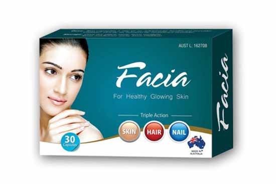 Facia là viên uống đẹp da được bào chế theo công thức bổ sung đầy đủ dưỡng chất cần thiết để làn da khỏe mạnh và sáng đẹp từ bên trong. Với chiết xuất từ nhiều thảo dược tự nhiên, viên uống Facia giúp làm chậm lại quá trình lão hóa ở da, thúc đẩy quá trình tái tạo, sản sinh tế bào da mới và ổn định cấu trúc da. Qua đó, Facia xóa mờ dần những khuyết điểm ở da như sạm màu, tàn nhang, đường nhăn, da khô ráp, giúp duy trì bề mặt da luôn mềm mại, căng bóng. Đặc biệt chứa thành phần biotin rất quan trọng đối với sự phát triển tế bào, thúc đẩy sản sinh axit béo và tế bào mới. Đồng thời, chúng còn chuyển hóa chất béo và protein, duy trì lớp mỡ cần thiết giúp da luôn mềm mại.