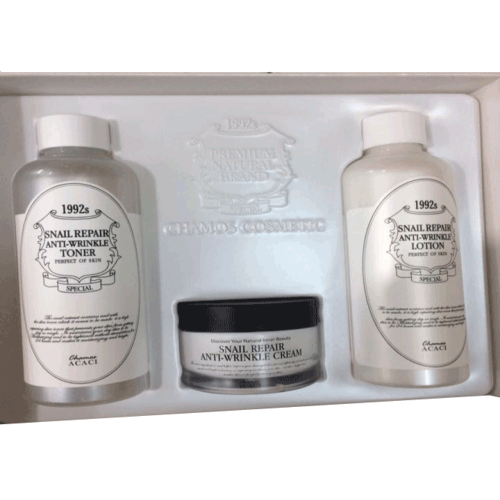 Bộ 3 sản phẩm chống lão hóa từ ốc sên Chamos Acaci Snail Repair Anti-Wrinkle bao gồm: Nước cân bằng Chamos Accai Snail Repair Anti-Wrinkle Toner, Nước hoa hồng Chamos Acaci Snail Repair Anti-Wrinkle Lotion, Kem dưỡng Chamos Acaci Snail Repair Anti-Wrinkle Cream.