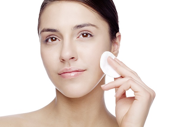 Rửa mặt thật sạch bằng sữa rửa mặt. Dùng khăn mềm thấm khô da. Sau đó, thấm nước hoa hồng vào bông tẩy trang rồi chấm đều lên toàn bộ khuôn mặt. Thoa kĩ ở vùng chữ T, vì đây là vùng tồn động lượng dầu nhờn khá nhiều.