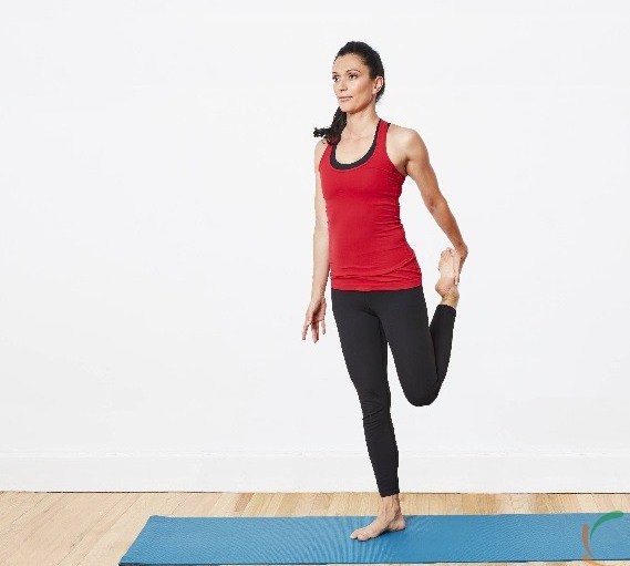 Bước 2: Tiến hành gấp chân phải về phía sau và giữ lại bằng tay phải, lòng bàn chân đặt hướng về mông và giữ cố định.