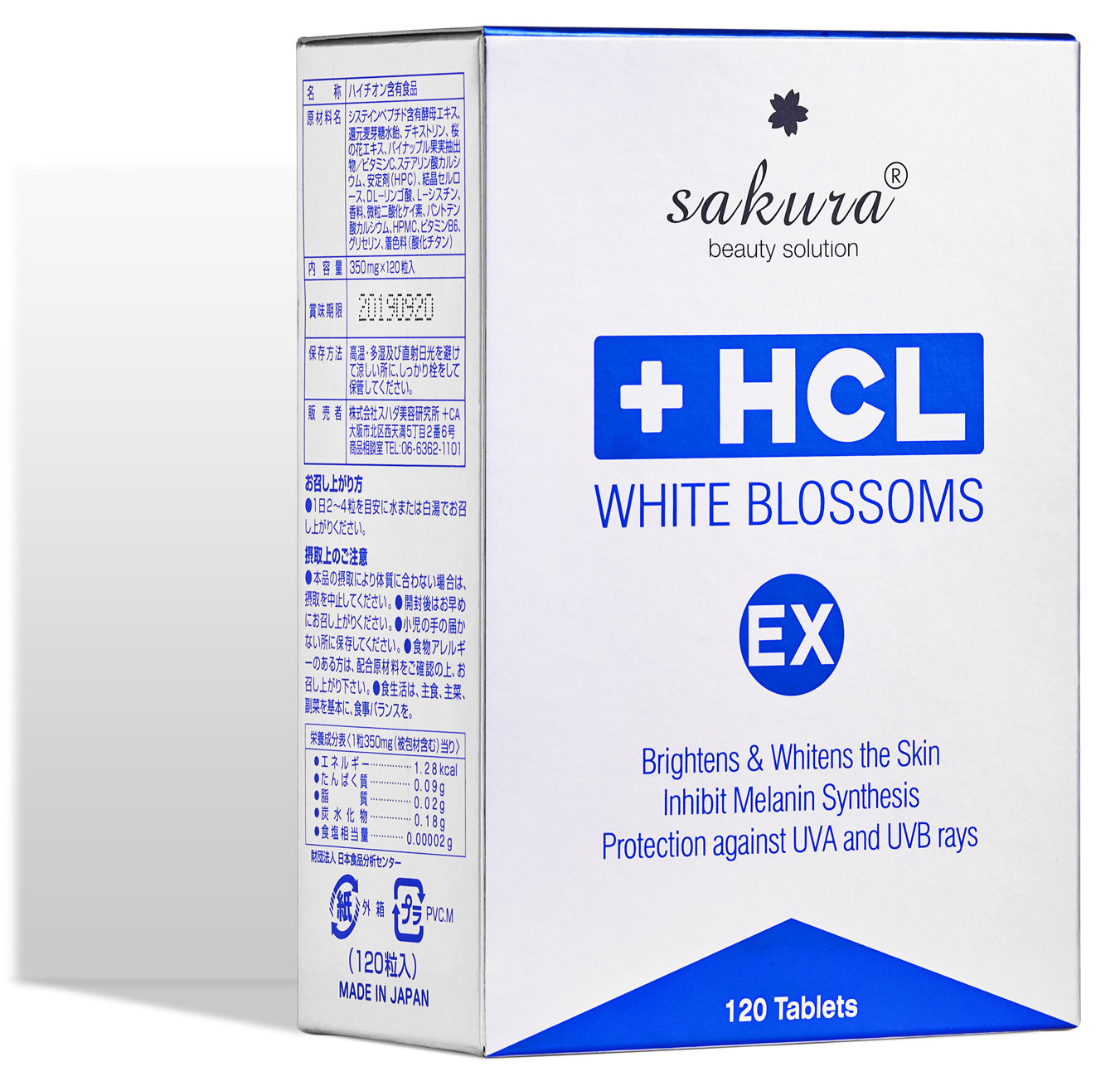 Sakura White Blossoms HCL Ex được các chuyên gia hàng đầu thương hiệu Sakura bào chế với công thức có chứa tinh chất nấm men, chiết xuất hoa anh đào, quả dứa, malic acid, vitamin C, B6... Sẽ tác động lên cơ chế sản sinh sắc tố melanin để ngăn ngừa các hắc sắc tố melanin tổng hợp quá mức trong cấu trúc da, đánh bay tổ hợp melanin dư thừa. Nhờ đó, ngăn ngừa và làm mờ đốm nâu, tàn nhang, vết thâm, sạm nám... dưỡng da trắng sáng rạng ngời.