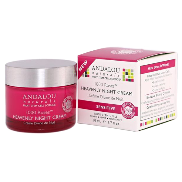 Andalou 1000 Roses™ Heavenly Night Cream có chứa các dưỡng chất từ tế-bào-gốc hoa hồng Alpine, chiết xuất trái lựu, lô hội. Sự kết hợp cùng nhau các hoạt chất “vàng” trong cùng một công thức sẽ thúc đẩy quá trình tái tạo da từ sâu bên trong, thay làn da cũ sần sùi và nám sạm thành làn da trắng sán rạng ngời. Đòng thời, hỗ trợ sâu tế bào, làm dịu, nuôi dưỡng và cải thiện làn da nhạy cảm, cân bằng da, phục hồi lớp rào chắn hydro lipid thiết yếu cho da và giúp đem lại làn da đẹp tự nhiên hoàn hảo.