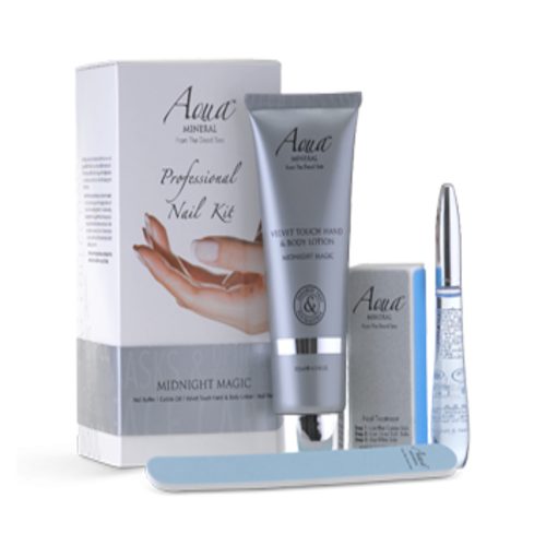 Bộ sản phẩm Aqua Mineral Small Nail Kit midnight magic bao gồm 4 sản phẩm: Miếng đệm, dầu biểu bì, dũa móng, sữa dưỡng thể.