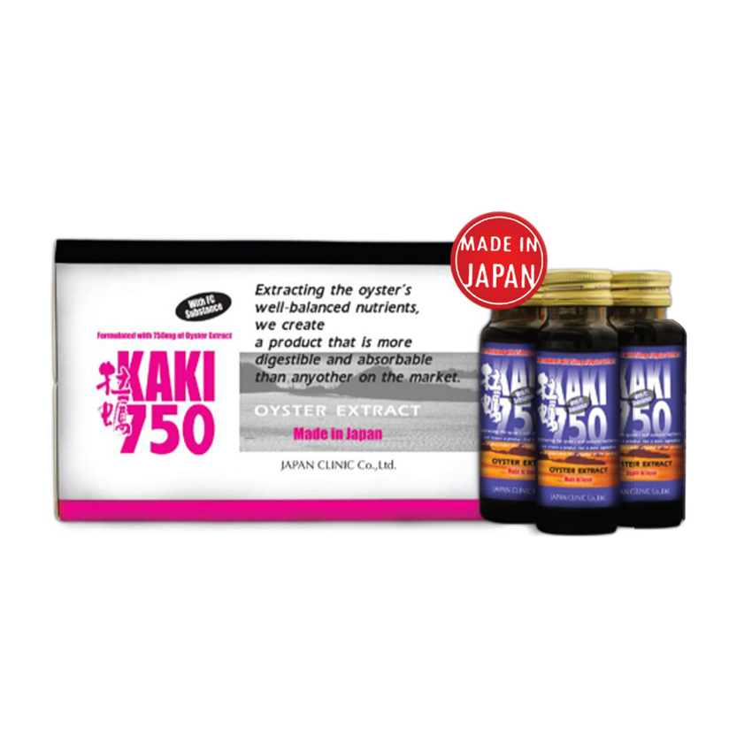 Nước uống tinh chất hàu Kaki 750 với nguyên liệu chính được chiết xuất từ hàu, kết hợp mật ong cùng nhiều vitamin C, B1,B2,B3, B6, hỗ trợ giảm cholesterol trong máu, bồi bổ sức khỏe, tăng cường sinh lực và cải thiện sinh lý nam giới. Sản phẩm cũng có thể sử dụng tốt cho phụ nữ để bồi bổ sức khỏe và chống lão hóa cho làn da. Đây là sản phẩm bồi bổ sức khoẻ nổi bật được nghiên cứu và phát triển bởi Japan Clinic.