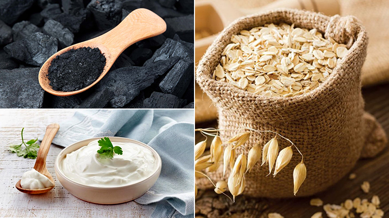 Chuẩn bị nguyên liệu: 1 muỗng bột than hoạt tính, 2 muỗng bột yến mạch, 2 muỗng sữa chua không