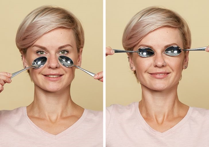 Lấy hai chiếc thìa cho vào ngăn mát tủ lạnh tầm 15 phút cho thìa lạnh rồi lấy ra áp lên vùng da bị bọng mắt và thực hiện động tác massage nhẹ nhàng. Đây là cách tăng cường tuần hoàn máu dưới da, dưỡng da vùng mắt tươi trẻ. Cùng với đó là dưỡng da vùng mắt săn chắc, không bị chảy xệ, giảm sưng, đồng thời làm thư giãn các mạch máu, giúp đôi mắt giảm mệt mỏi và bọng mắt hiệu quả.