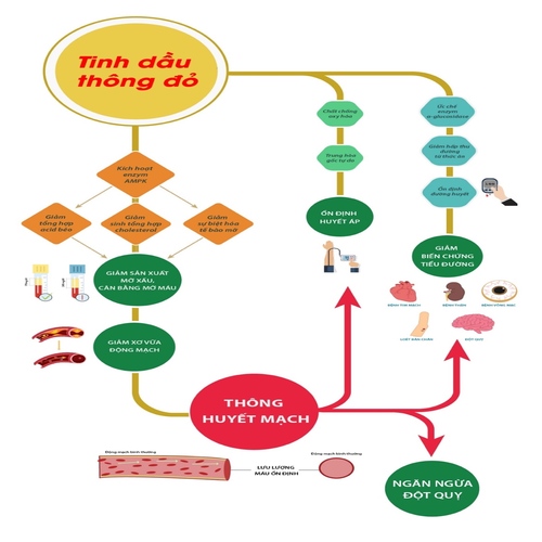 Bên cạnh đó, tinh dầu thông đỏ còn có tác dụng thông huyết mạch hiệu quả, giúp ổn định huyết áp, giảm nguy cơ đột quỵ, nhồi máu cơ tim và ngăn ngừa các biến chứng bệnh tiểu đường. Không những thế, tính kháng viêm và chống khuẩn từ tinh dầu thông đỏ còn giảm được tình trạng sưng tấy và đau nhức của người bị viêm khớp.
