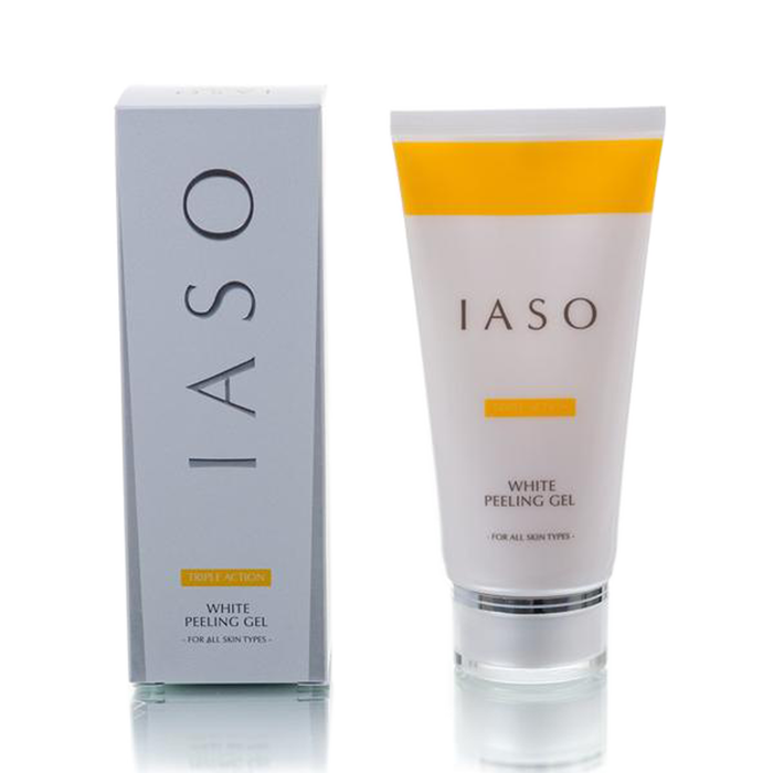 Gel tẩy tế bào chết và làm trắng da IASO White Peeling Gel là sự kết hợp độc đáo giữa tinh chất nhân sâm, bạch quả, lô hội, cám gạo, vỏ bưởi, cà rốt… Sẽ nhẹ nhàng lấy đi lớp da chết thô sần và bong tróc trên bề mặt da và tận sâu trong lỗ chân lông. Đồng thời, cuốn trôi hoàn toàn mụn cám, bụi bẩn, tạp chất và các sợi bã nhờn, trả lại làn da vẻ sạch sáng và láng mịn hơn.