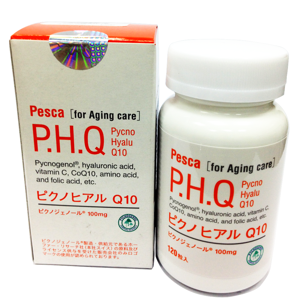 Pesca P.H.Q Pcyno Hyalu Q10 là sản phẩm làm đẹp da dạng viên uống được nghiên cứu và phát triển bởi Chủ tịch HĐQT Công ty TNHH Quốc tế Pesca, Nhật Bản – bà Sakuma Hisako. Đây là sự kết hợp đỉnh cao của thành phần chống oxy hoá mạnh mẽ Pycnogenol® cùng hyaluronic acid, Coenzyme Q10 và các thành phần hỗ trợ làm đẹp da, giúp da sáng và mịn màng hơn, giảm thiểu tác hại của tia UV với da, chống lão hoá toàn diện, phòng ngừa các chứng bệnh do tập quán sinh hoạt…