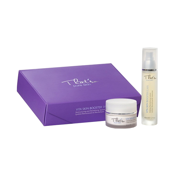 That’so Vita Skin Booster System mang đến giải pháp chống lão hoá vượt trội nhưng tiết kiệm, giúp cải thiện độ săn chắc, nâng cơ và lấy lại sức sống tươi trẻ cho làn da đang có nguy cơ lão hoá hoá với Lotion tái tạo da That’so Vita Skin Booster Elixir và Kem phục hồi và chống lão hóa da That’so Vita Skin Booster Cream.