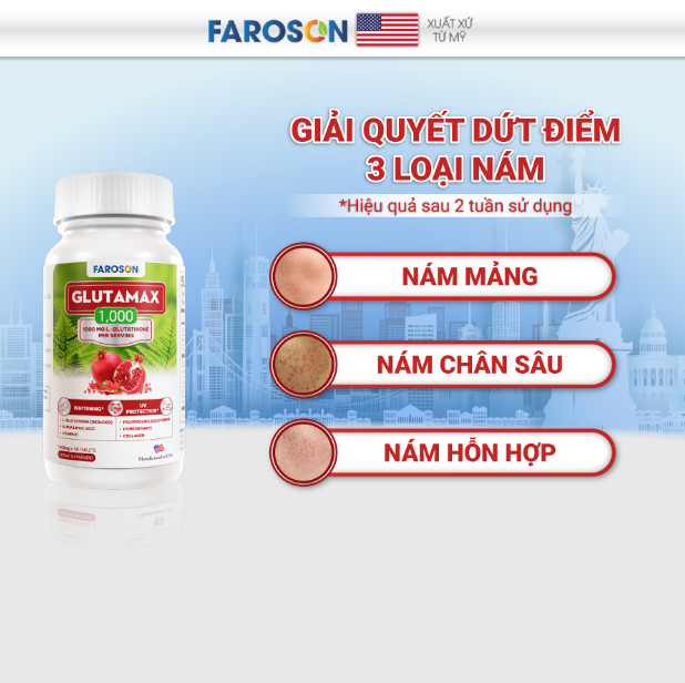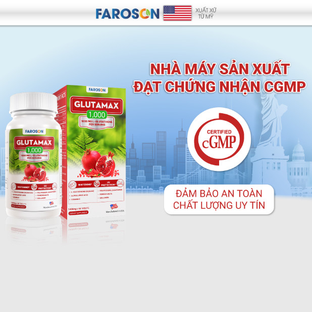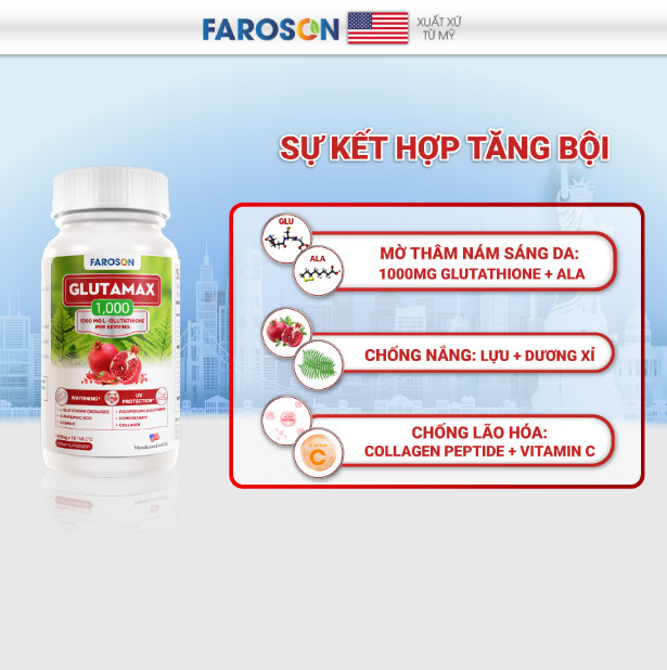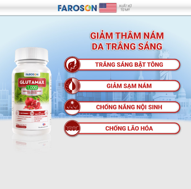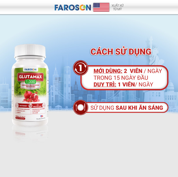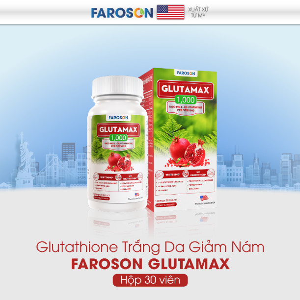 Viên uống Faroson Glutamax 1000 có tác dụng hỗ trợ làm tăng độ đàn hồi của da, ngăn ngừa lão hóa da, làm da trắng sáng vượt trội và làm mờ các vết sạm da cũng như thâm nám.