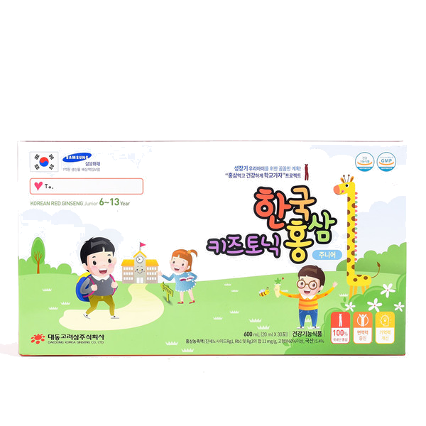 Hồng sâm trẻ em 6-13 tuổi Daedong Korean Red Ginseng Junior chiếm 5.4% hồng sâm nguyên chất, cùng nước tinh khiết, kết hợp cùng chiết xuất dâu tây, mật ong, chất xơ hòa tan fructooligosaccharide, chiết xuất nhung hươu nai, chiết xuất đương quy, chiết xuất rễ vàng, bột hỗn hợp khoáng vitamin, bột omega – tinh dầu cá... sẽ bổ sung dưỡng chất cần thiết để tăng cường sức khỏe và bồi bổ trí não cho trẻ nhỏ.