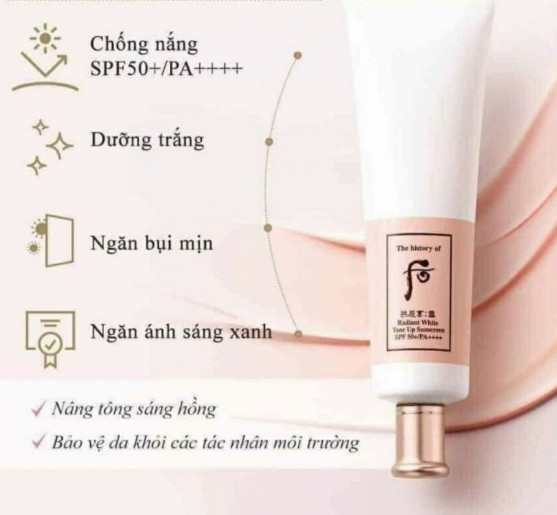 Kem chống nắng The history of Whoo vượt xa chức năng bảo vệ da thông thường khi có chứa tinh chất dưỡng da từ các thành phần Đông y. Sản phẩm Kem chống nắng nâng tông Gongjinhyang Seol Radiant White Tone Up Sunscreen SPF50+,PA++++ có khả năng bảo vệ da khỏi tia UVA, UVB và làm giảm đốm nâu, sáng da đều màu sau một thời gian sử dụng.