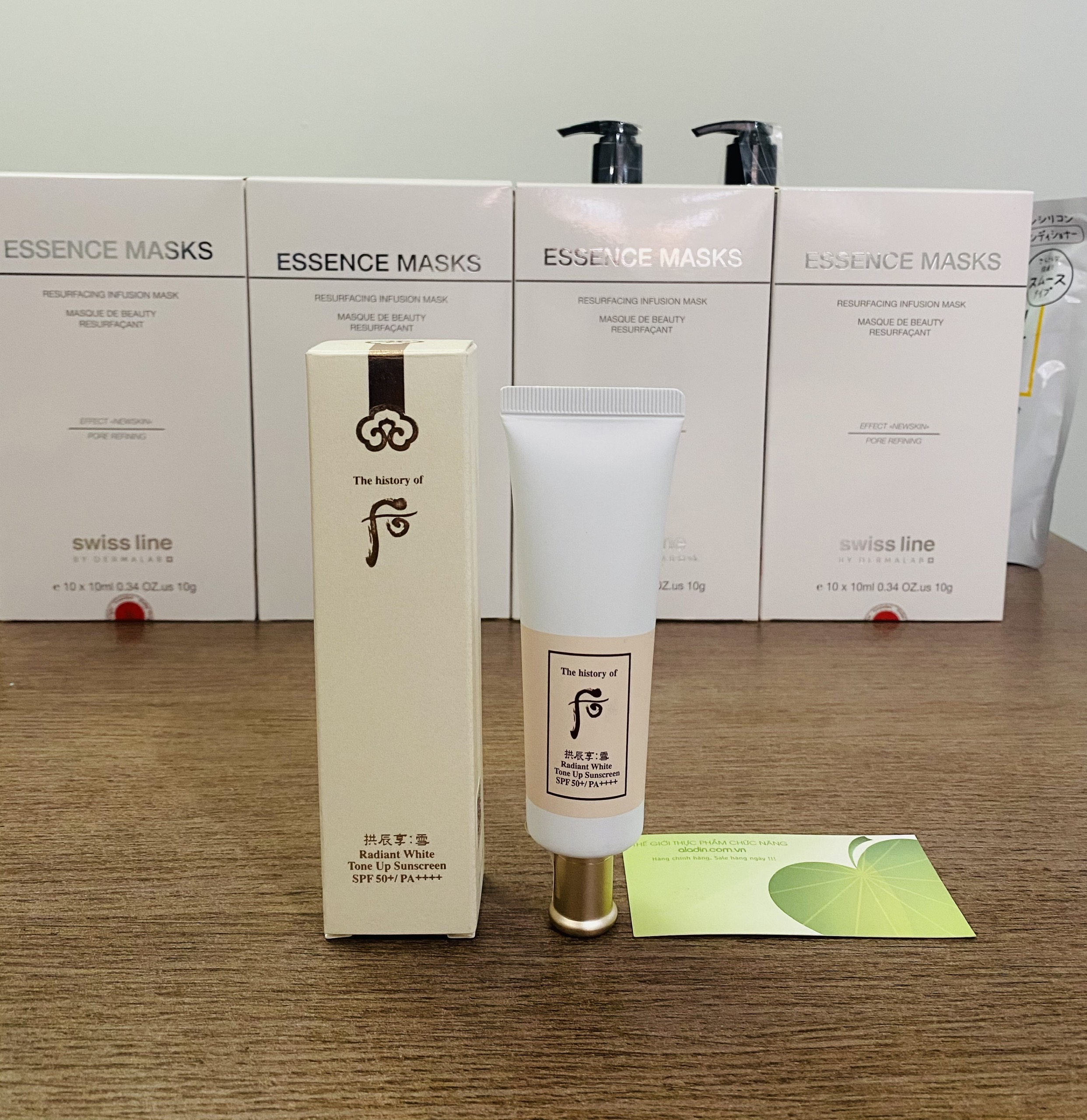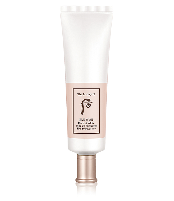 Kem chống nắng The history of Whoo Seol Radiant White Tone Up Sunscreen có thành phần được chiết xuất từ Nhân sâm núi ngọc trai, Cam Cúc làm dịu da và giảm đốm nâu hiệu quả.