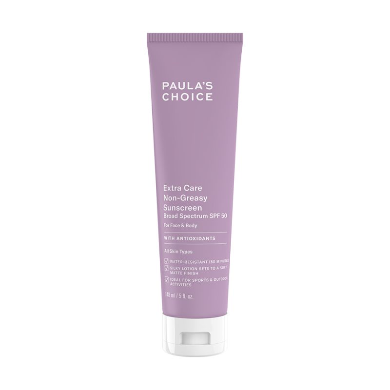 Với chỉ số SPF 50, Kem chống nắng siêu chịu nước Paula’s Choice Suncare Extra Care Non Greasy Sunscreen SPF 50 có khả năng bảo vệ da khỏi 98% tác hại của ánh nắng xuyên suốt 8 giờ đồng hồ. Sản phẩm có cấu tạo mịn mượt, mềm mại nhưng không để lại lớp kem bết rít trên da mà vẫn giúp bề mặt da khô ráo, thoải mái cả ngày dài. Bên cạnh đó, thành phần chứa phức hợp chống nắng hóa học kết hợp với chất chống lão hóa sẽ giữ ẩm da giúp tối ưu hóa khả năng bảo vệ da chống lại tác hại của ánh nắng. Sản phẩm không chứa cồn, hương liệu và chất tạo màu giúp giảm nguy cơ kích ứng da, khô ráo và tiệp màu da, thích hợp với mọi loại da, đặc biệt là da mụn.
