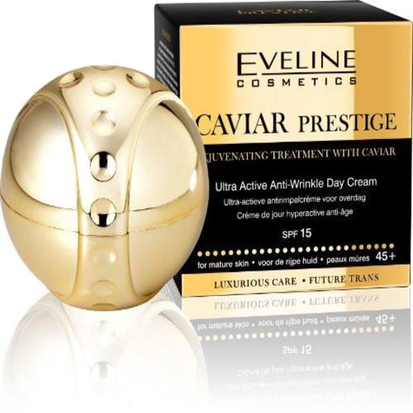Eveline Caviar Prestige 45+ Ultra Activi Smoothing Eye Cream sẽ bổ sung dưỡng chất nuôi dưỡng làn da mắt tươi trẻ và căng tràn sức sống, cải thiện các dấu hiệu lão hóa da vùng mắt bằng cách xóa nhăn, dưỡng ẩm, làm mờ quầng thâm và đánh tan bọng mắt.