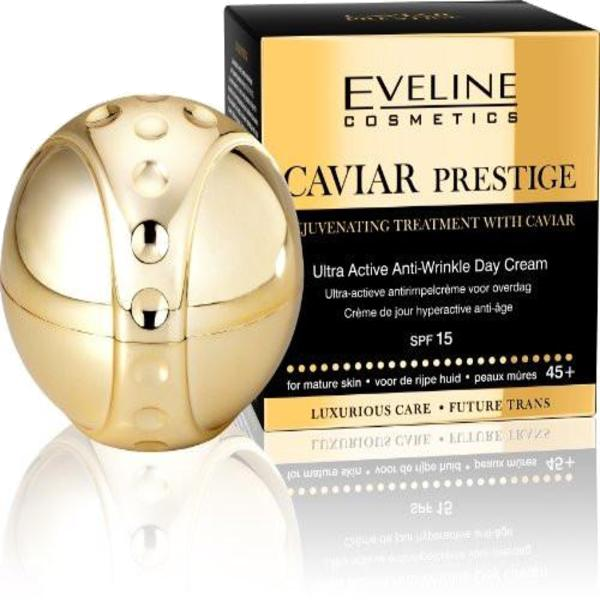 Kem dưỡng ngày trẻ hóa da Eveline Caviar Prestige 45+ Ultra Active Anti-Wrinkle Day Cream được bào chế từ công thức có chứa trứng cá muối.