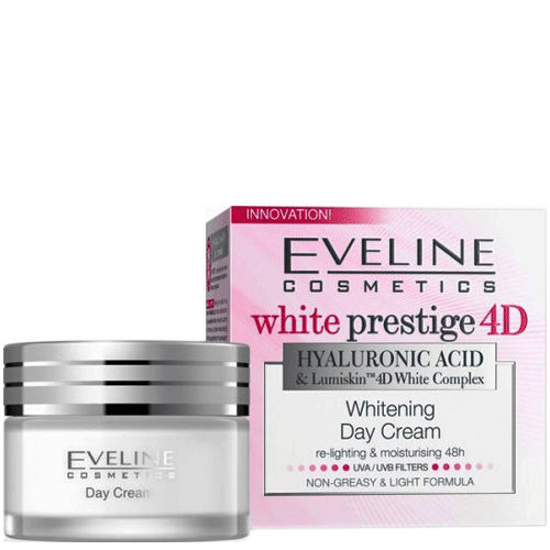 Kem dưỡng trắng da ban ngày Eveline White Prestige 4D Whitening Day Cream ứng dụng công nghệ Lumiskin™ 4D tiên tiến giúp làm sáng da, cân bằng sắc tố trên da, dưỡng ẩm, kích thích sự phát triển của tế bào da non trẻ, ngăn ngừa sự hình thành của các đốm sậm màu.