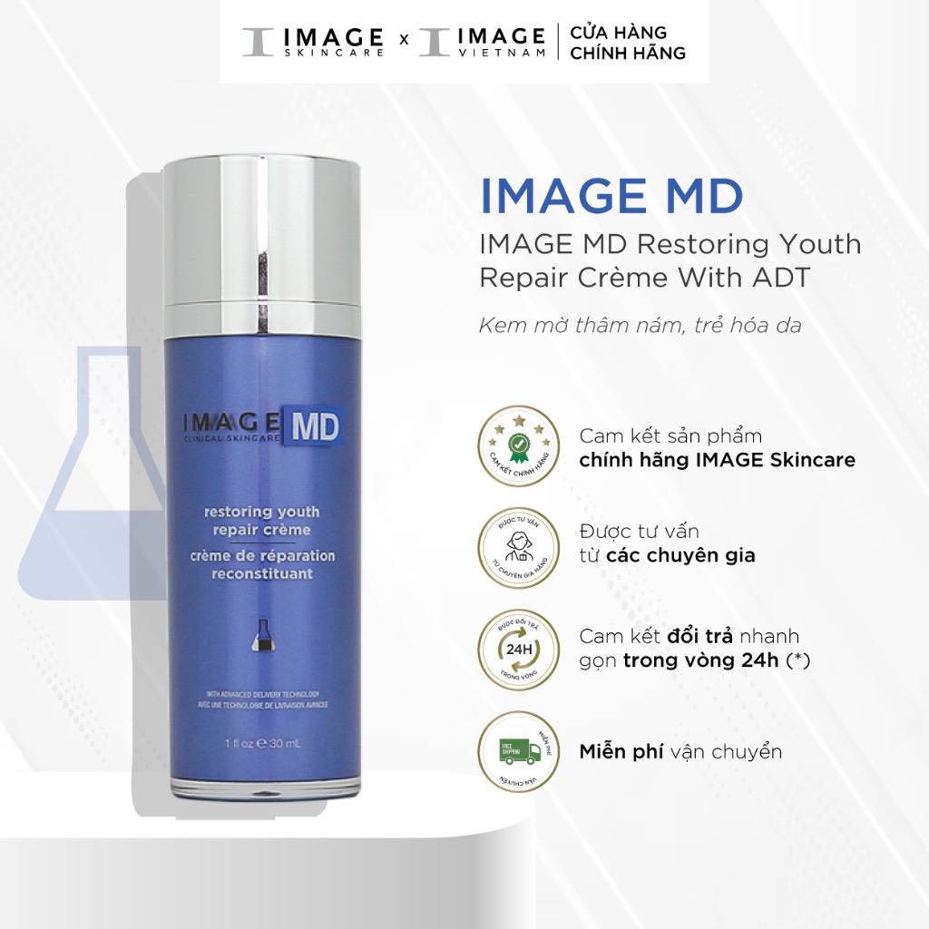 Kem phục hồi và trẻ hóa da Image MD Restoring Youth Repair Crème chứa các thành phần dưỡng chất độc đáo như retinol, glycolic và vitamin C cùng công nghệ độc đáo giúp thành phần hoạt tính được đưa vào lớp sâu hơn của da. Qua đó, làn da được tăng cường liên kết, phục hồi độ đàn hồi, cho bề mặt căng mịn, trẻ trung, săn chắc và rạng rỡ hơn. Image MD Restoring Youth Repair Crème with ADT Technology hoạt động theo cơ chế loại bỏ lớp sừng hóa, nhờ đó bề mặt da trở nên thông thoáng, tạo điều kiện cho việc sản sinh tế bào mới nhằm loại bỏ các tế bào chết dưới da. Sau thời gian ngắn sử dụng, kem trẻ hóa da này giúp làm đều màu da, nuôi dưỡng làn da tươi mới, khỏe khoắn hơn.