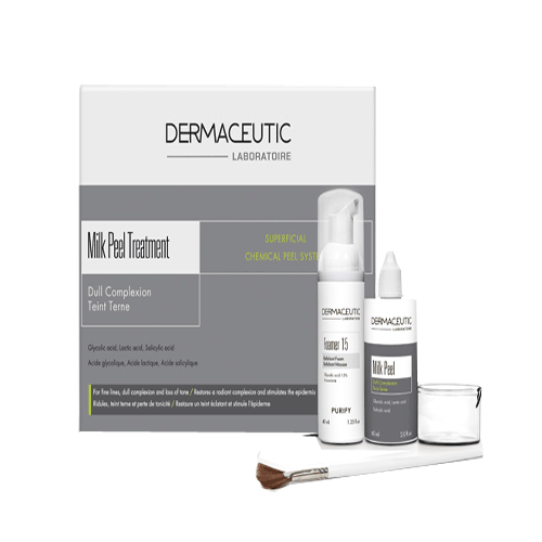 Liệu trình cải thiện tone màu da, loại bỏ nếp gấp Dermaceutic Milk Peel Treatment có chứa acid glycolic, acid salicylic và acid lactic. Đây là phương pháp thay da hóa học, bằng cách sử dụng các acid để loại bỏ các tế bào chết, lấy đi lớp da sần sùi, hư hỏng và tối màu, đồng thời làm sạch lỗ chân lông và giảm nhăn để thay vào đó là làn da tươi mới, săn chắc, sáng trắng và rạng rỡ.