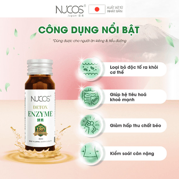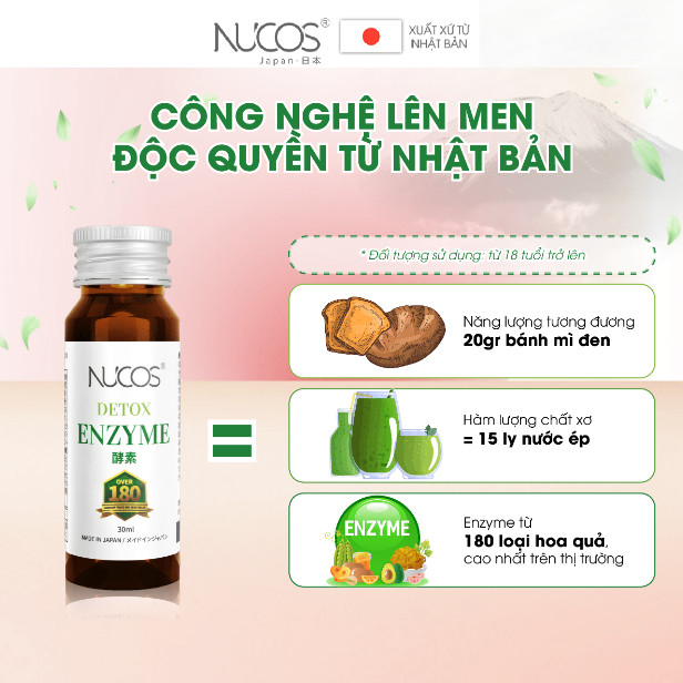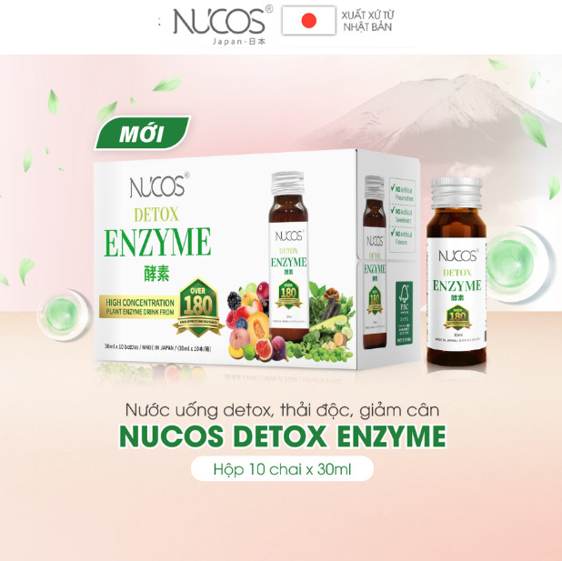 Nước uống detox lên men Nucos Detox Enzyme với công nghệ lên men từ hơn 180 loại trái cây & rau củ độc quyền tù Nhật Bản, giúp bổ sung Enzyme tự nhiên cùng 3000mg chất xơ, lợi khuẩn, vitamin nhóm B.