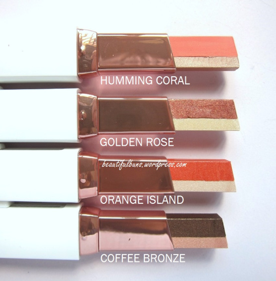 Bên cạnh đó, sản phẩm có chứa tinh thể của 7 loại đá quý với những sắc tố khoáng hút sáng cùng hiệu ứng nhũ ngọc trai giúp vùng da quanh mắt trở nên tươi sáng rực rỡ hơn bao giờ hết. Sản phẩm còn sở hữu 4 tông màu độc đáo gồm Humming Coral (No.1), Golden Rose (No.2), Orange Island (No.3), Coffee Bronze (No.4). Mỗi thanh phấn mắt gồm 2 màu mắt khác biệt, do vậy bạn gái có thể kết hợp cùng lúc hoặc sử dụng từng màu mắt với các màu phấn khác nếu cần. Đặc biệt, chỉ cần thoa nhẹ, hai màu sắc của thanh phấn mắt này đã tự hoà quyện vào nhau như thể được phối hợp bởi chuyên gia trang điểm nhờ đường cắt chéo tinh tế của sản phẩm.