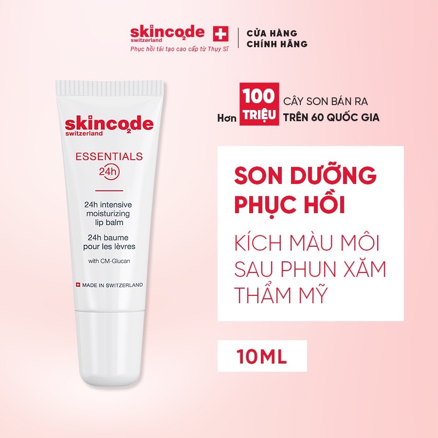 Skincode 24h Intensive Moisturizing Lip Balm chứa các phức hợp Hydrating Complex, Shea Butter, Pro Vitamin B5. Đặc biệt là công nghệ độc quyền được cấp bằng sáng chế y tế CM-Glucan. Mang đến công hiệu phục hồi tế bào môi từ sâu bên trong, giúp vết thương mau lành, bảo vệ làn môi mỏng manh trước các tác động xấu từ môi trường, tránh viêm nhiễm sau phun xăm môi. Mang đến cho bạn đôi môi căng bóng, khỏe mạnh. Đồng thời, son dưỡng còn thúc đẩy quá trình lưu thông máu, ngăn ngừa tối ưu tình trạng thâm môi, loang màu, nhạt màu, giúp môi lên màu chuẩn đẹp như ý.