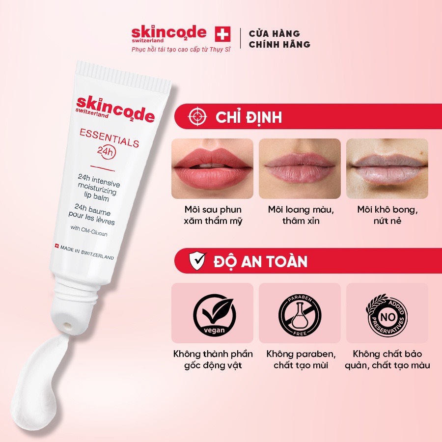 Skincode 24h Intensive Moisturizing Lip Balm thúc đẩy quá trình lưu thông máu, ngăn ngừa tối ưu tình trạng thâm môi, loang màu, nhạt màu, kích màu môi lên đều màu, chuẩn tone mà không ảnh hưởng tới màu sắc mực xăm.