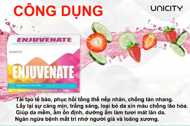 - Bên cạnh công dụng làm đẹp da, Enjuvenate Unicity còn đem lại nhiều tác dụng tuyệt vời trong việc trẻ hóa cơ thể, nâng cao sức khỏe, hỗ trợ cải thiện các vấn đề phát triển cơ, cải thiện trí nhớ ở người già. Nâng cao chất lượng tình dục.