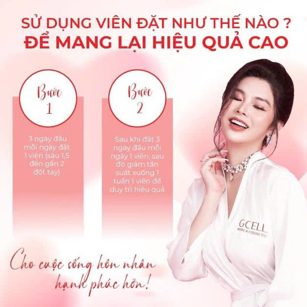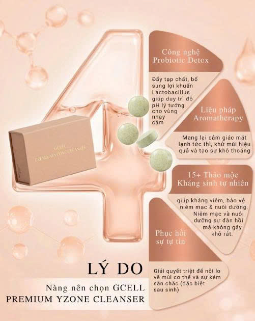 Viên đặt Gcell Premium Yzone Cleanser của thương hiệu Anthawin đến từ Thái Lan. Thành phần của viên đặt là sự kết hợp giữa khổ sâm, cam thảo, đinh hương, hạnh đào, sả sàng tử... giúp phục hồi độ dày thành âm đạo để se khít âm đại hiệu quả và tăng ham muốn, đồng thời làm giảm sắc tố để làm hồng “cô bé”. Đồng thời, giúp làm sạch mọi tinh dịch tích tụ vào bên trong đọng ngay ống phần phụ, loại bỏ tế bào chết, tạp khuẩn, dịch thừa để ngăn ngừa và chống viêm nhiễm âm đạo hiệu quả, chữa lành các tổn thương trên âm đạo, duy trì sức khỏe dài lâu.