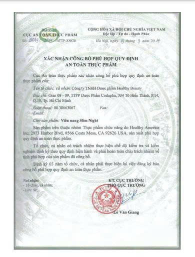 Slim Night là loại thực phẩm chức năng được Công ty Healthy America của Mỹ sản xuất dựa trên nguồn nguyên liệu thảo dược thiên nhiên, có công dụng bổ sung tinh chất hỗ trợ quá trình giảm cân an toàn và đạt hiệu quả cao. Sản phẩm chứa chiết xuất từ lá cây hoè có khả năng hạ huyết áp, giảm cholesterol trong máu, ngăn ngừa xơ vữa động mạch, bảo vệ sức khoẻ tim mạch, phòng chống hiện tượng máu và gan nhiễm mỡ. Thêm vào đó, hoạt chất Senna leaves trong lá cây hoè có thể lọc máu, giải độc gan, kích thích tiêu hoá, nhuận tràng, thông đại tiện chống táo bón. Kết hợp với thành phần L.acidophilus là men tiêu hóa, sản phẩm giúp ổn định môi trường trong ruột nhằm hỗ trợ điều trị chứng tiêu chảy, đầy hơi và khó tiêu.