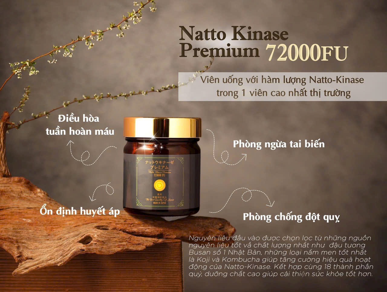 với chiết xuất từ nguyên liệu đầu vào được chọn lọc những sản phẩm tốt nhất như đậu tương Busan tốt nhất Nhật Bản, những loại nấm men tốt nhất là Koji và Kombucha giúp tăng cường hiệu quả hoạt động của Natto- Kinase. Kết hợp cùng 18 thành phần quý, dưỡng chất cao giúp cải thiện sức khỏe tốt hơn.