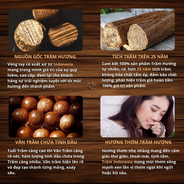 Sản phẩm được chế tác từ trầm hương có xuất xứ từ rừng Indonesia với tuổi trầm trên 25 năm. Vân trầm ấn tượng với quầng dầu bọc quanh hạt tạo thành màu đen sẫm socola đẹp mắt. Về mùi thơm, trầm Indo Vip cũng có mùi thơm sống mạnh, ngọt bùi sữa, đảm bảo mang đến trải nghiệm hoàn toàn mới cho người dùng về trầm hương.