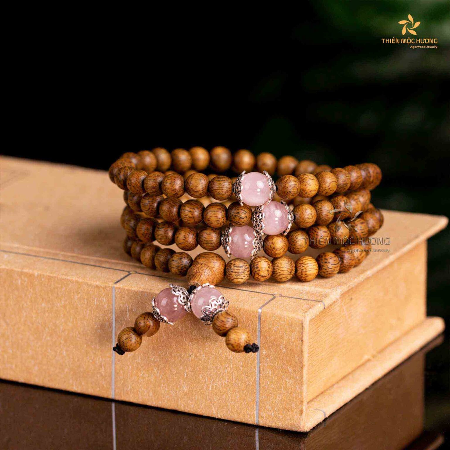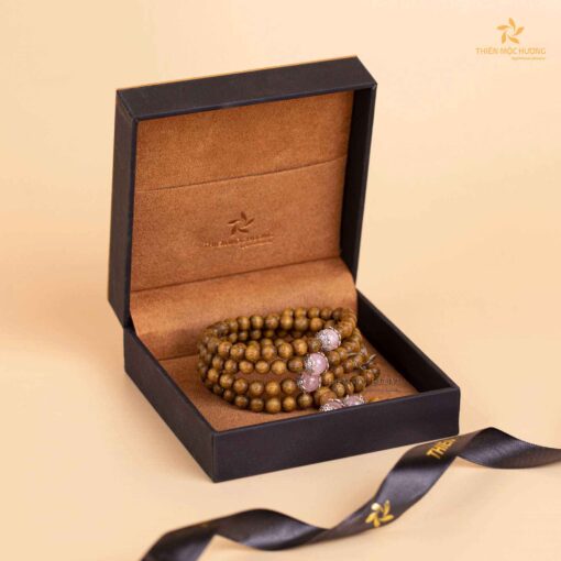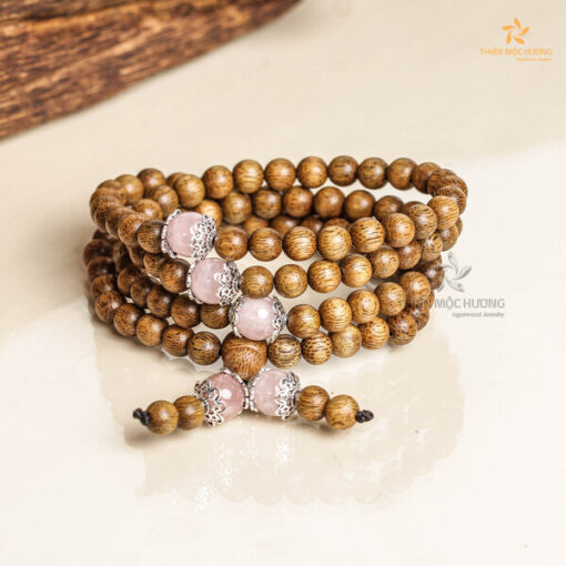 Vòng Tay Trầm Hương 108 Hạt Ngọc Bảo Charm Thạch Anh tóc hồng