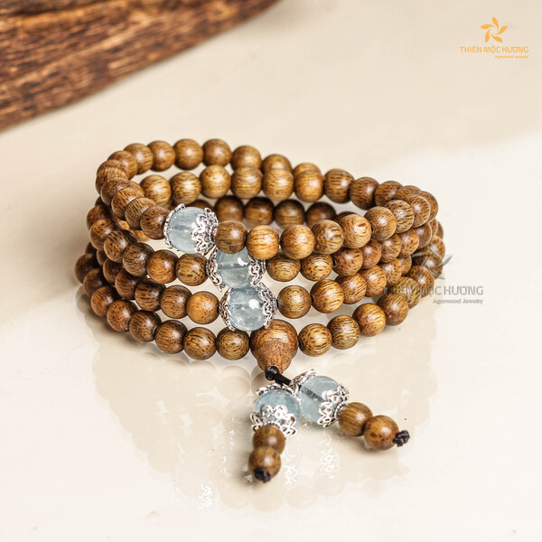 Vòng Tay Trầm Hương 108 Hạt Ngọc Bảo Charm Aquamerine