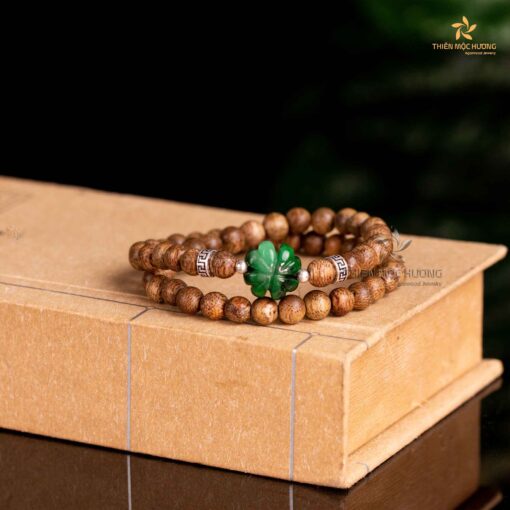 Vòng tay trầm hương Tứ Diệp Bảo Đôi Thiên Mộc Hương Charm Cẩm thạch xanh