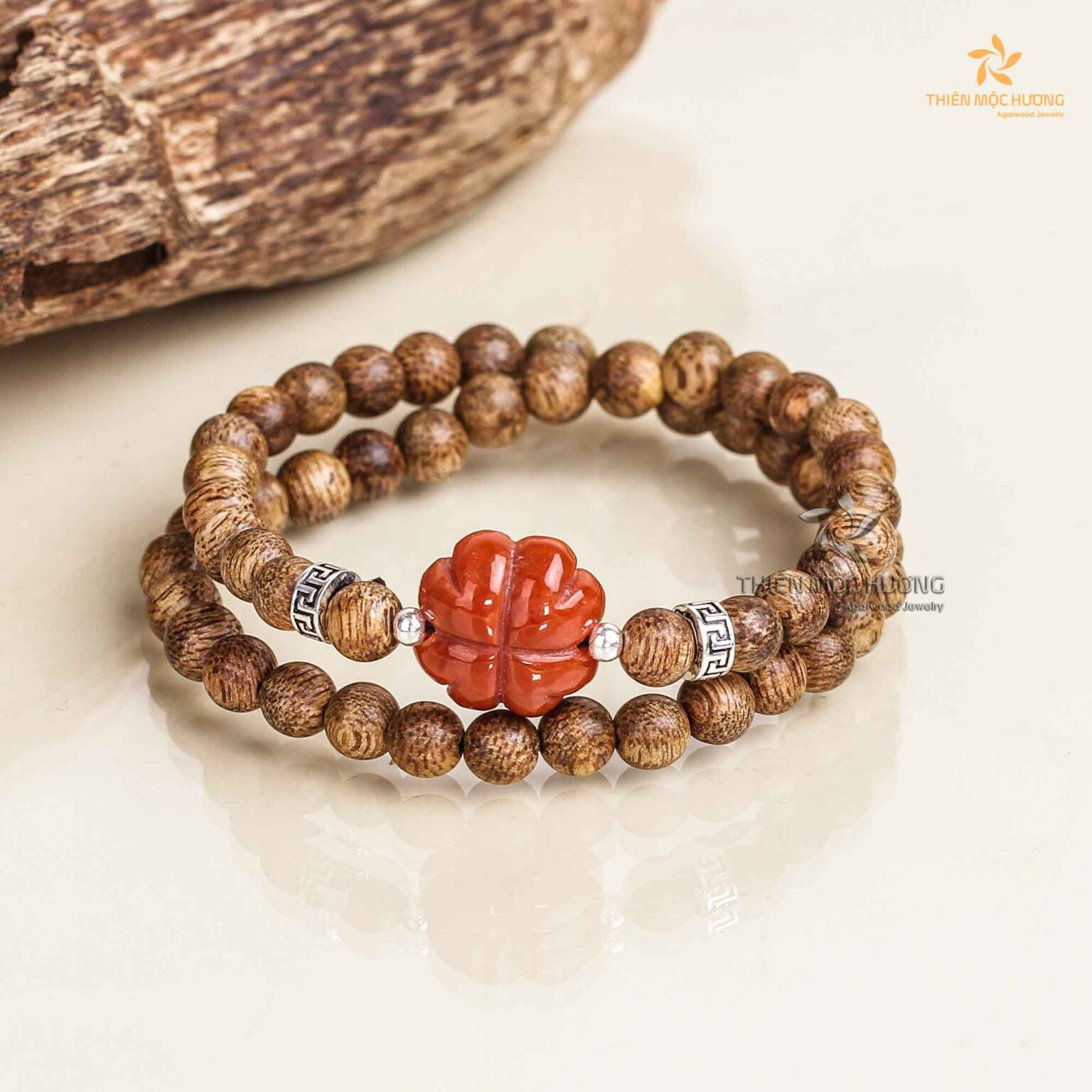 Vòng tay trầm hương Tứ Diệp Bảo Đôi Thiên Mộc Hương Charm Cẩm Thạch Huyết