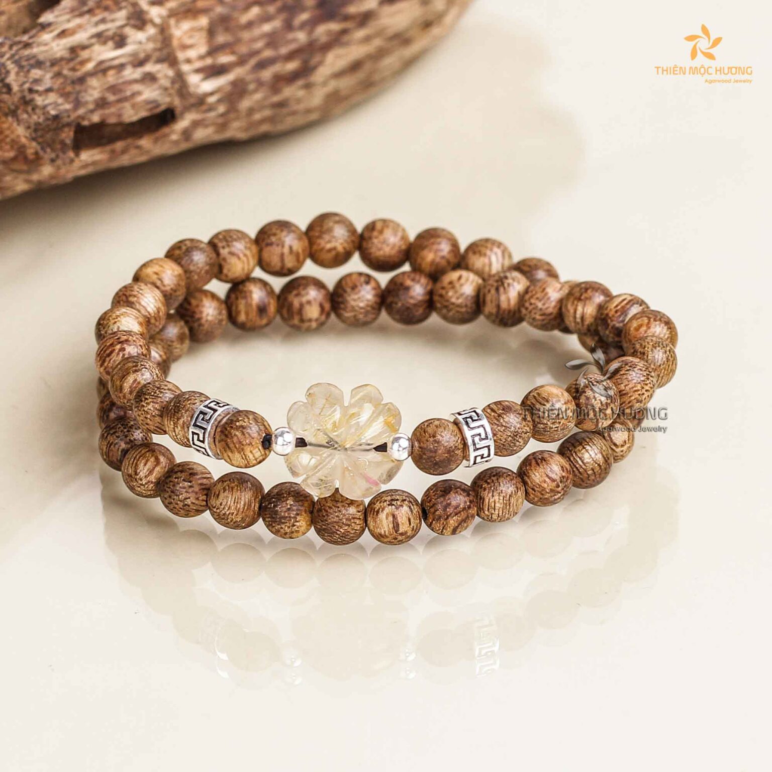 Vòng tay trầm hương Tứ Diệp Bảo Đôi Thiên Mộc Hương Charm Cẩm Thạch Tóc vàng