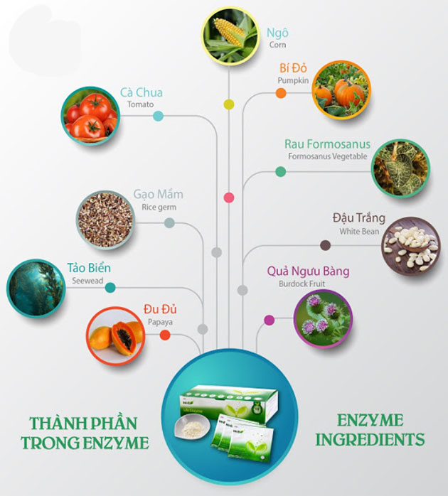 Chiết xuất từ: bắp, lúa mì, thơm, đậu trắng, chuối, đu đủ, seaweed, gạo mầm, cà chua, bí đỏ, quả ngưu bàng và rau formosanus