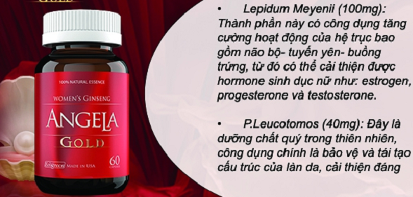 Công thức của Sâm Angela Gold có chứa Lepidium Meyenii - chất được chứng minh khả năng tăng cường hệ trục não bộ - tuyến yên - buồng trứng, nhờ đó cải thiện bộ 3 nội tiết tố nữ như estrogen, progesterone và testosterone, tăng cường sức khỏe, sinh lý nữ, dưỡng da tươi trẻ, ngực săn chắc.