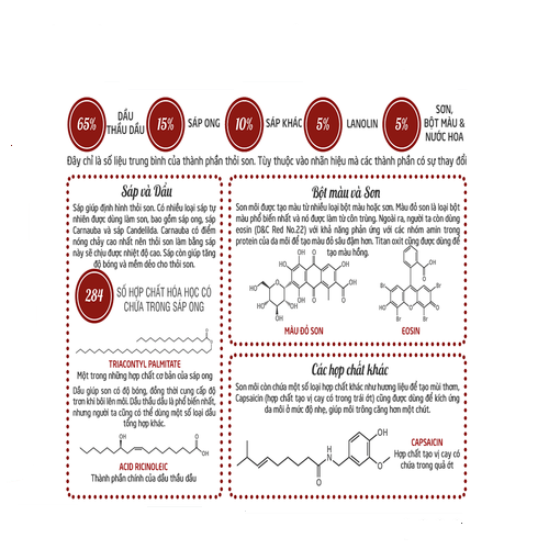 Bài viết dưới đây sẽ giúp các bạn khám phá những thành phần phổ biến mà các thương hiệu nổi tiếng thường sử dụng cho một thỏi son nhé. Và khi các bạn biết được các thành phần chứa trong một thỏi son, thì sẽ lựa chọn cho mình được những sản phẩm son môi vừa đảm bảo được chất lượng, uy tín cũng như sự an toàn cho làn môi khi dùng.