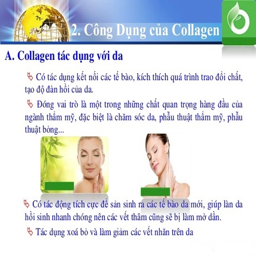 Collagen ngoài chức năng kết nối các tế bào da, còn có nhiệm vụ tạo ra sự đàn hồi, kích thích quá trình trao đổi chất. Con người chúng ta khi bước vào tuổi 30, lượng collagen bắt đầu suy giảm cả số lượng và chất lượng, khiến cho làn da bị lão hóa. Vì thế, collagen là nhân tố quan trọng nhất giúp hồi phục và tái tạo da đạt hiệu quả cao cho phụ nữ duy trì sự trẻ trung của mình.