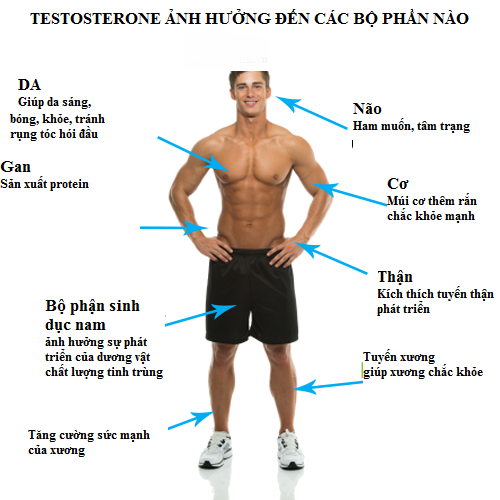 Nếu estrogen là nhựa sống quan trọng đối với sức khỏe và sắc đẹp nữ giới, thì testosterone là hormone thiết yếu giúp định hình các đặc tính nam giới, sức mạnh tình dục, thể chất và tinh thần. Hormone này chịu trách nhiệm cho quá trình hình thành và phát triển cơ quan sinh dục nam, ảnh hưởng đến các đặc tính sinh dục nam như tăng sản sinh tuyến bã, hưng phấn, ham muốn tình dục, trưởng thành ở tinh trùng hay tăng mọc lông tóc, giọng trầm… Ngoài ra, hormone testosterone còn làm tăng tổng hợp protein, thúc đẩy hệ cơ bắp phát triển, kích thích tạo hồng cầu, thúc đẩy quá trình phân bào giúp tốc độ phục hồi sau chấn thương hay mệt mỏi nhanh hơn.