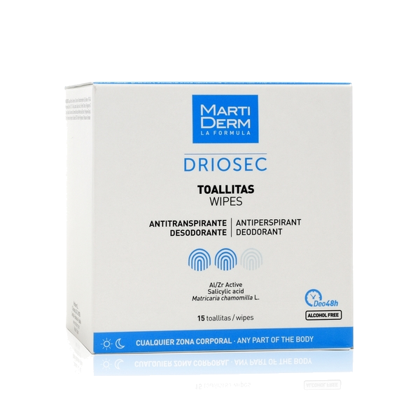 Martiderm Driosec Wipes có chứa 10% Al / Zr, chất có khả năng ngăn chặn sự hoạt động quá mức của tuyến mồ hôi dưới da, giảm lượng mồ hôi thoát ra ở nách, bẹn, lòng bàn tay, bàn chân... Nhờ đó, ngăn chặn cơ thể bốc mùi.