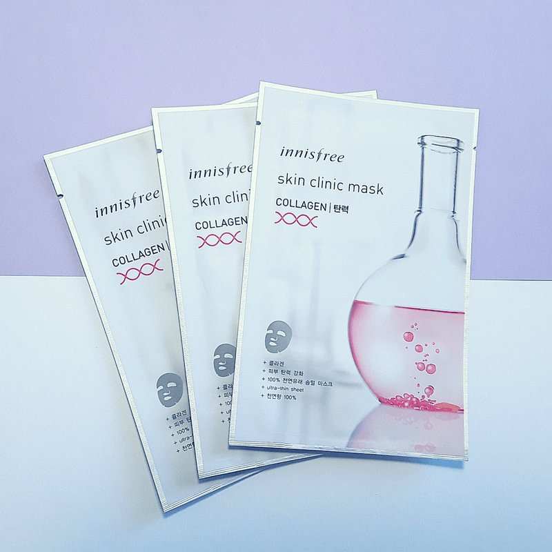 Mặt nạ Innisfree Skin Clinic Mask – Collagen sẽ cung cấp collagen cần thiết cho làn da để đánh thức sự tươi mới, săn chắc và đàn hồi, làm mờ các nếp nhăn và vết chân chim.